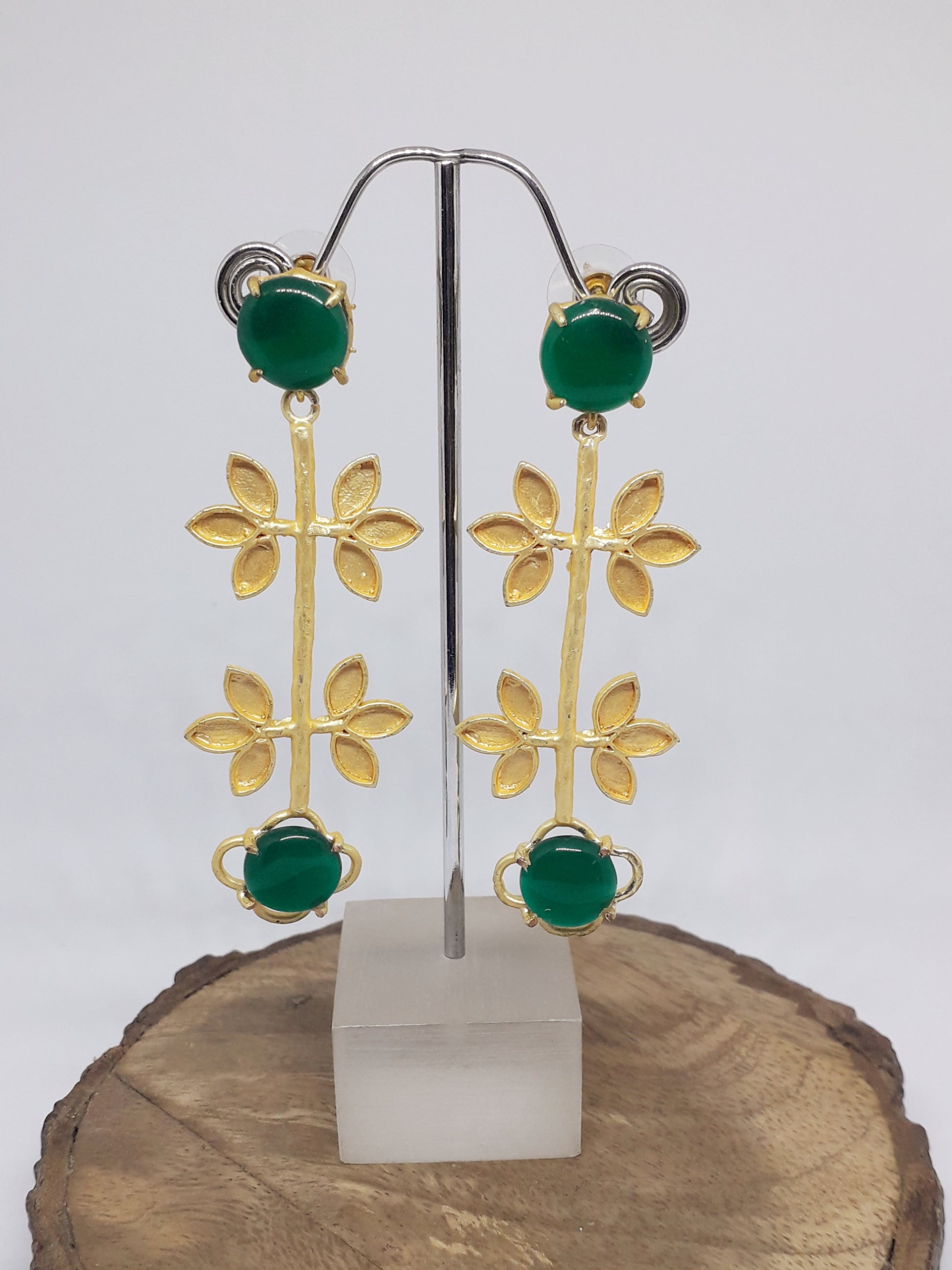 Gold Base Matte Finish Long Green Shade Leaf Themed Earrings